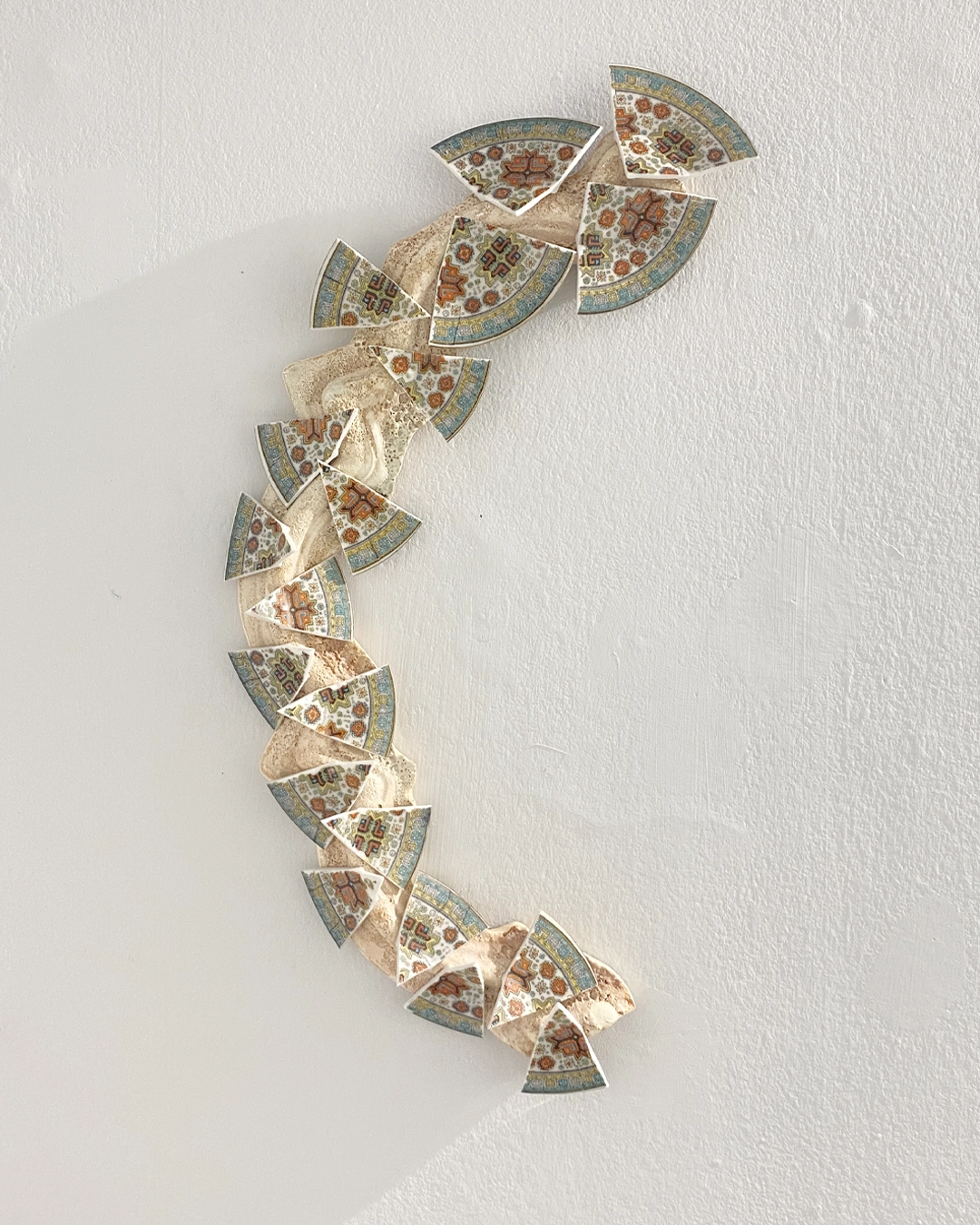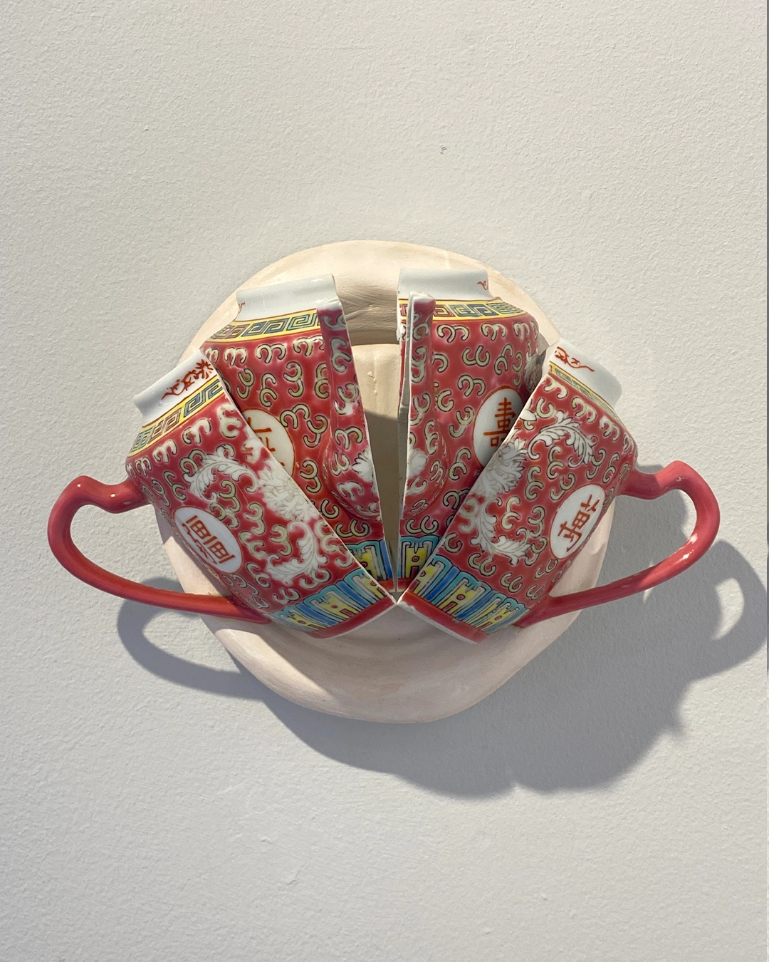 La práctica de Erika Díaz se sitúa en una investigación material donde la cerámica, el textil y otros medios se articulan en torno a la forma y su capacidad de contener memoria. A partir de la transformación de objetos cotidianos —indumentaria, vajillas, elementos ornamentales—, sus piezas se construyen mediante operaciones de corte, costura, ensamblaje y reconfiguración que desplazan su función y los convierten en superficies donde se inscriben gestos, afectos e historias. En este proceso, la fragilidad no se entiende como debilidad, sino como una condición activa. Lo blando se adapta, persiste y ocupa espacio. Los objetos, muchas veces provenientes de otros contextos, cargan con historias de circulación y desplazamiento; son ajenos y, al mismo tiempo, han hecho parte de una mezcla e hibridación de aquello que ahora nos pertenece. La materia retiene huellas y permite que se articulen relaciones entre lo íntimo y lo colectivo.