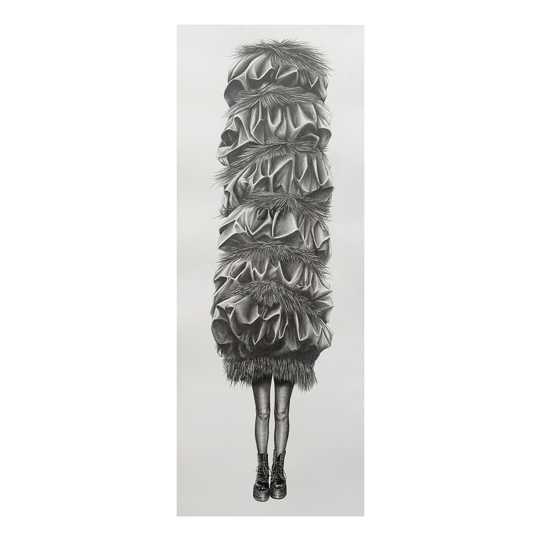 Giovanni Rojas explora a través de la técnica del dibujo con grafito, la relación entre arte y moda. Con lapremisa de “la profundidad de la apariencia” nos invita a mirar más allá del traje como prenda;