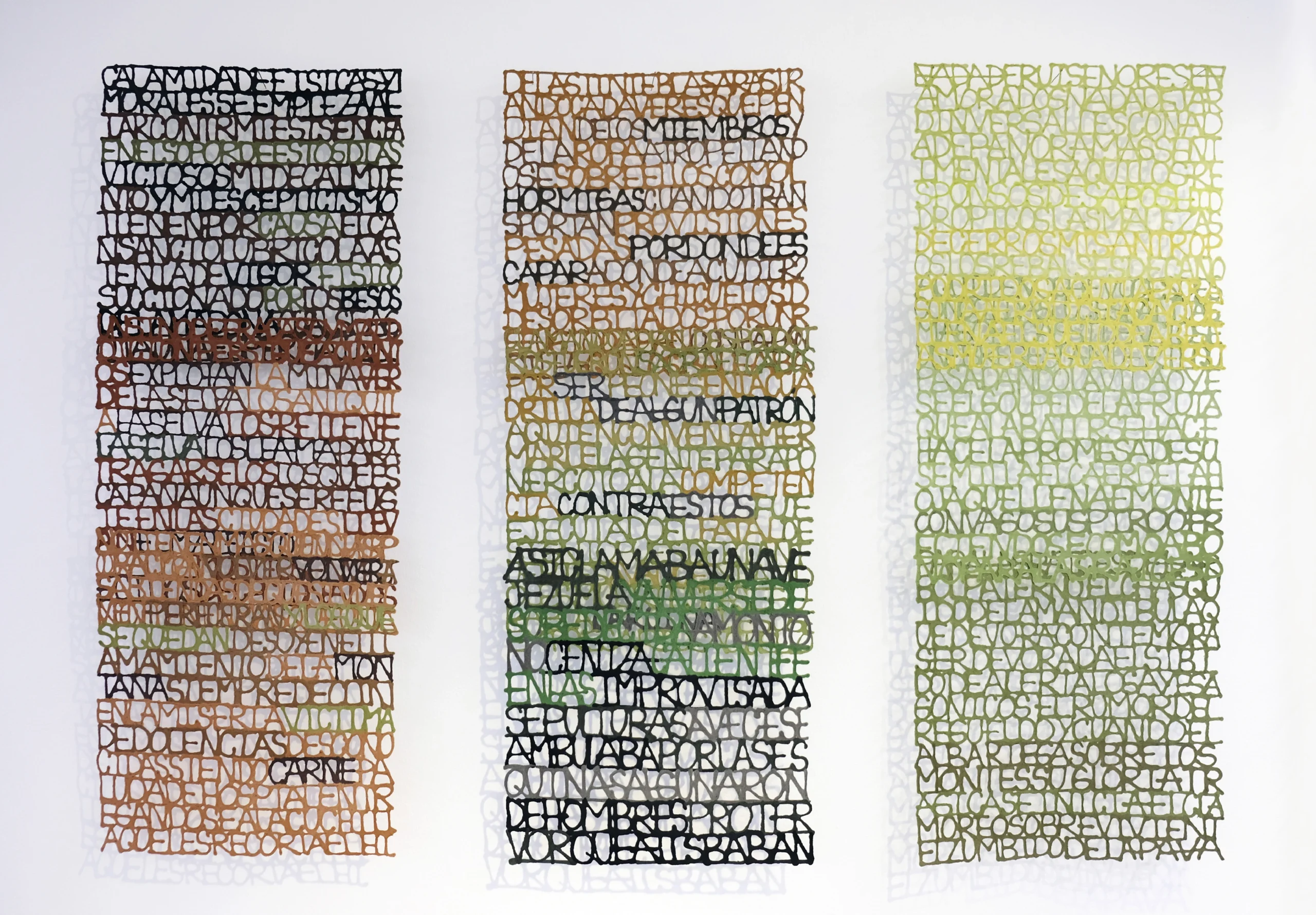 La obra de la artista Miriam Londoño se desarrolla en torno al papel, un material que se presta a todo tipo de transformaciones conceptuales y formales. En lugar de dibujar o escribir sobre papel, la artista utiliza la pulpa líquida para trazar letras y palabras como si tejiera una red en el espacio. Sus trabajos son libres soportes quedan como escritos y dibujos en el aire.