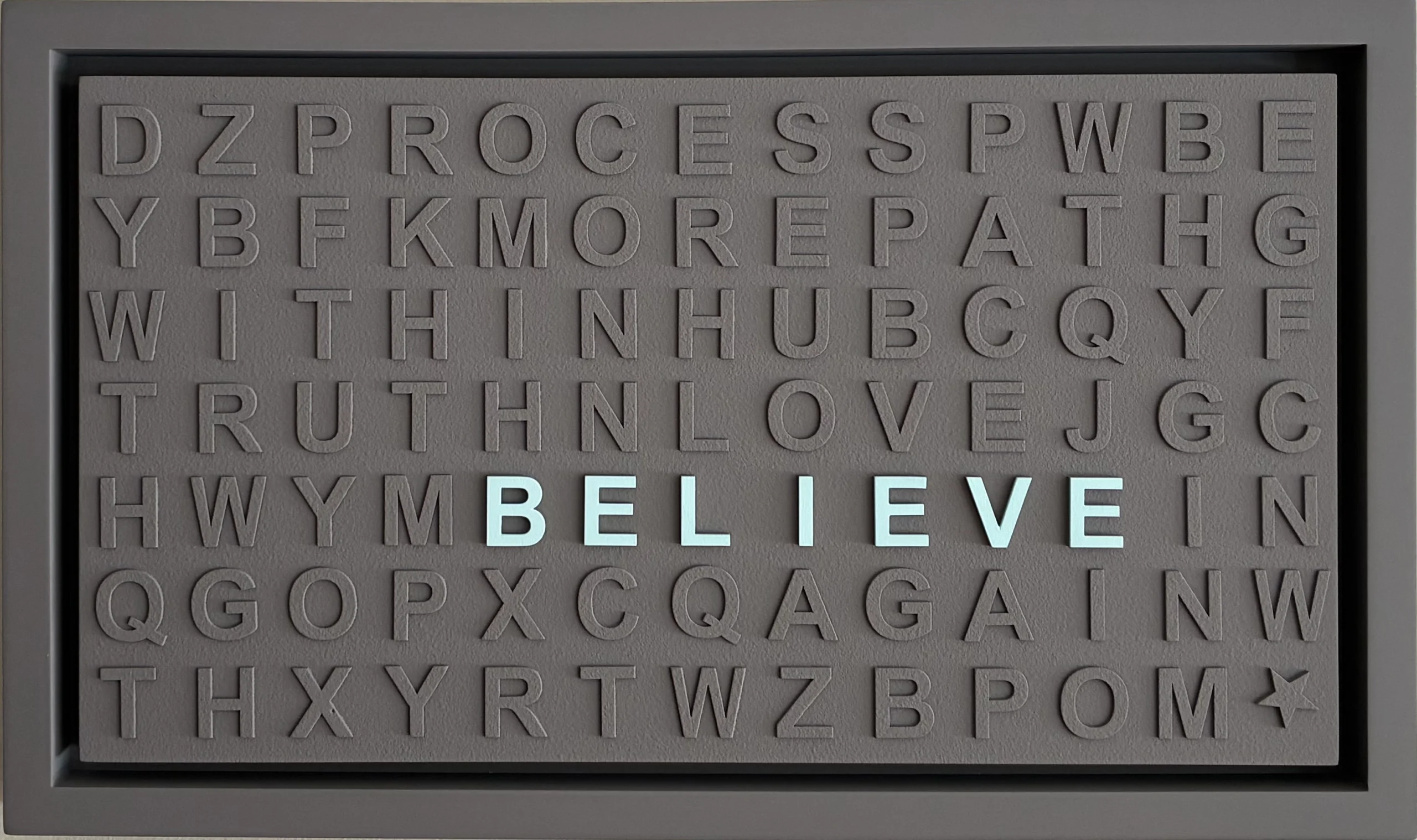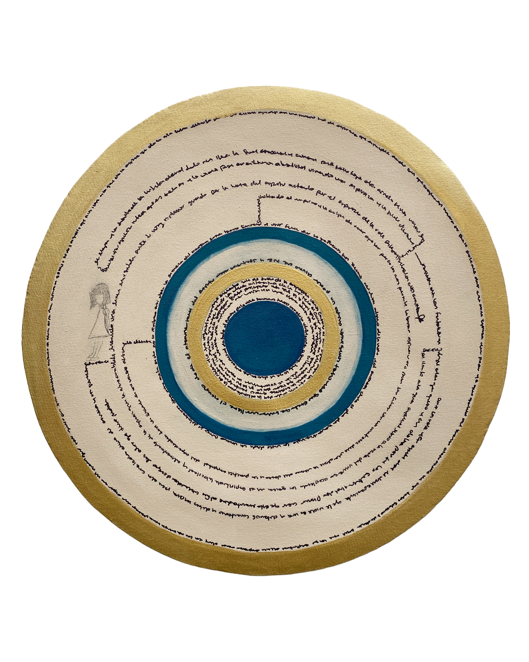 María Otero transforma el lenguaje en materia plástica, creando tramas de letras donde leer y mirar se confunden. En sus “Sopas de Letras”, el color y el humor invitan a descubrir mensajes ocultos y a conectar lo íntimo con lo colectivo, haciendo de las palabras un espacio también emocional.