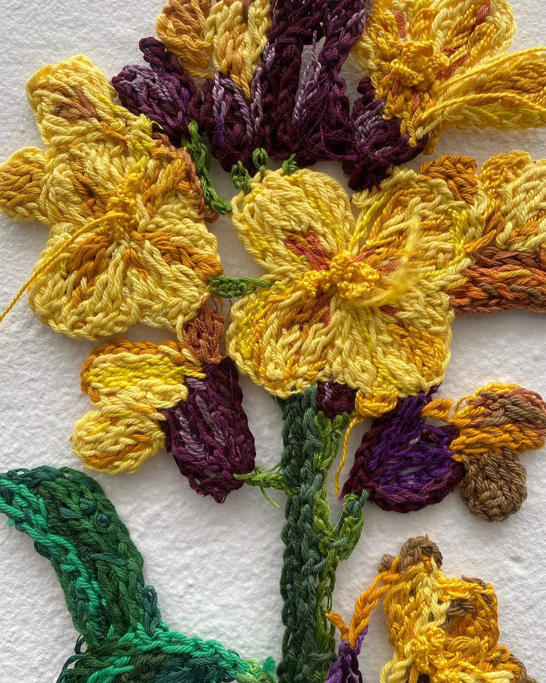 A menudo, Srta. Lylo parece una figura anacrónica en el tiempo, inmersa en el bordado de recuerdos que la conecta con el pasado, el presente y seguramente el futuro. Si la ves paseando por la calle, es muy probable que esté observando todo a su alrededor con curiosidad. No es una exageración; ha creado obras inspiradas por la belleza cotidiana que encuentra en su entorno. Desde una baldosa hidráulica hecha con PunchNeedle hasta un conmovedor bordado de su perra Maga, inmortalizada con agujas e hilos para la eternidad. También ha tejido fotos con la técnica del stumpwork y ha transformado el recuerdo de la boda de sus abuelos maternos en un emotivo bordado phototransfer.