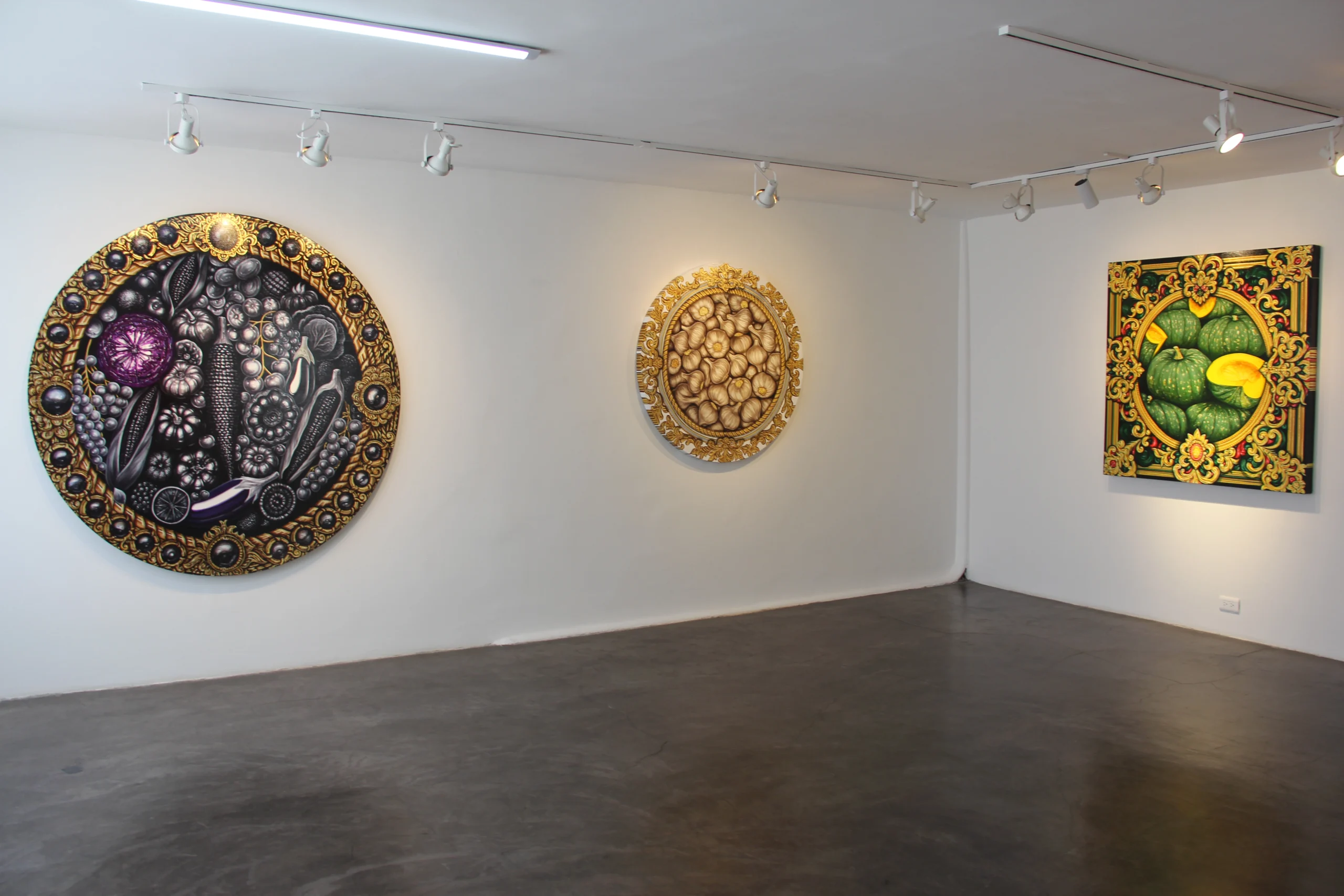 Sus composiciones, de una belleza inquietante, revelan cómo las frutas de temporada, antaño símbolo de renovación natural y de un equilibrio ancestral con la tierra, han sido reemplazadas por productos estandarizados que circulan sin raíces, sin aroma, sin historia. En las superficies brillantes de sus pinturas, el color del banano dialoga con el destello del oro y el verde hipnótico de la esmeralda, trazando un paralelismo entre los ciclos de extracción que han marcado la economía nacional: de la mina al cultivo, de la riqueza natural al agotamiento del suelo.
